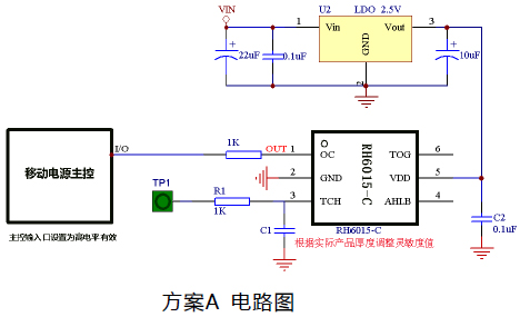 方案A:在觸摸芯片前單獨(dú)加LDO穩(wěn)壓,主控輸入口識(shí)別高電平有效時(shí),選用RH6015-C。